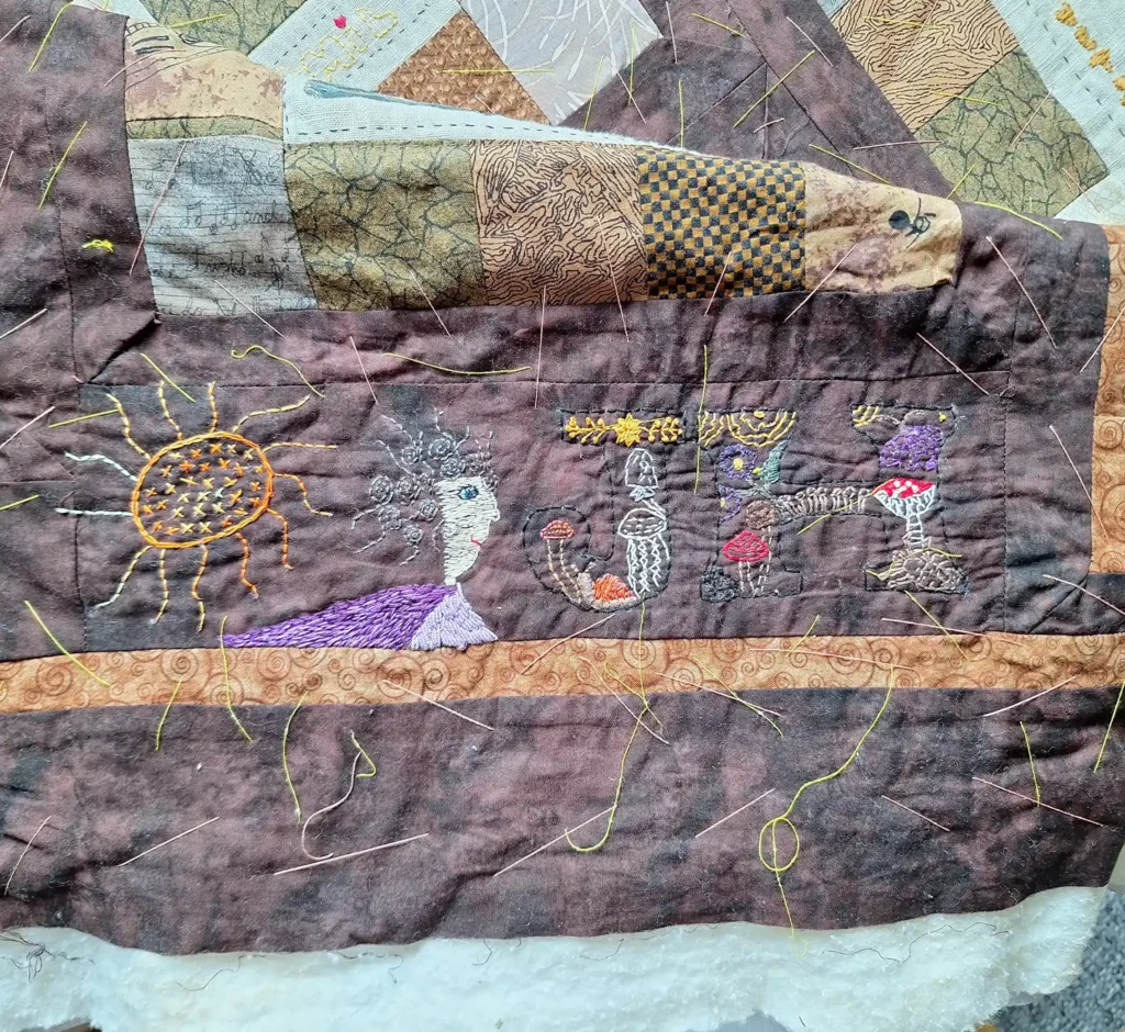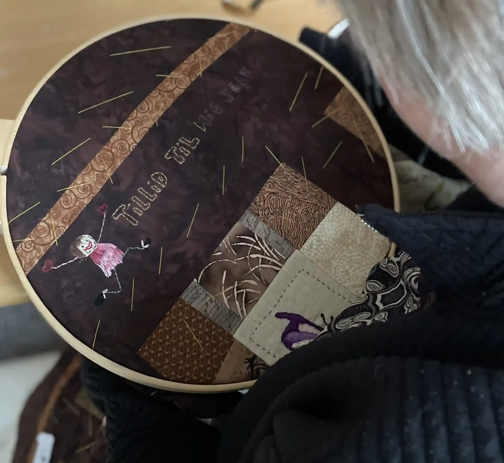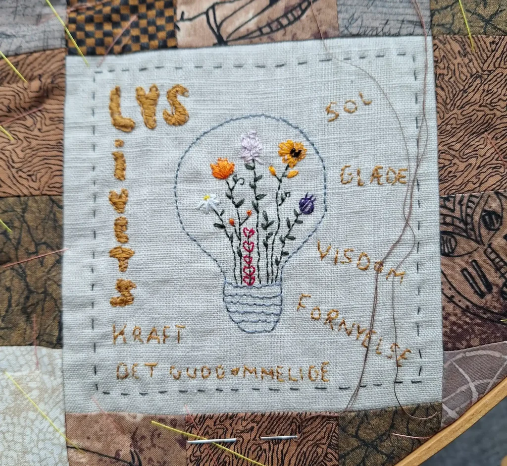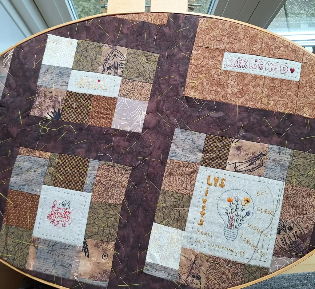 ”Først fandt jeg motiver og opmuntrende citater og tegnede selv mønstre op med en lystavle for at kunne overføre det til stof. Stofstykkerne blev målt op, klippet til og broderet. Og endelig blev det quiltet. Det var en krævende proces, men jeg er så tilfreds med resultatet. Og min hverdagsglæde er vendt tilbage,” fortæller Jette.