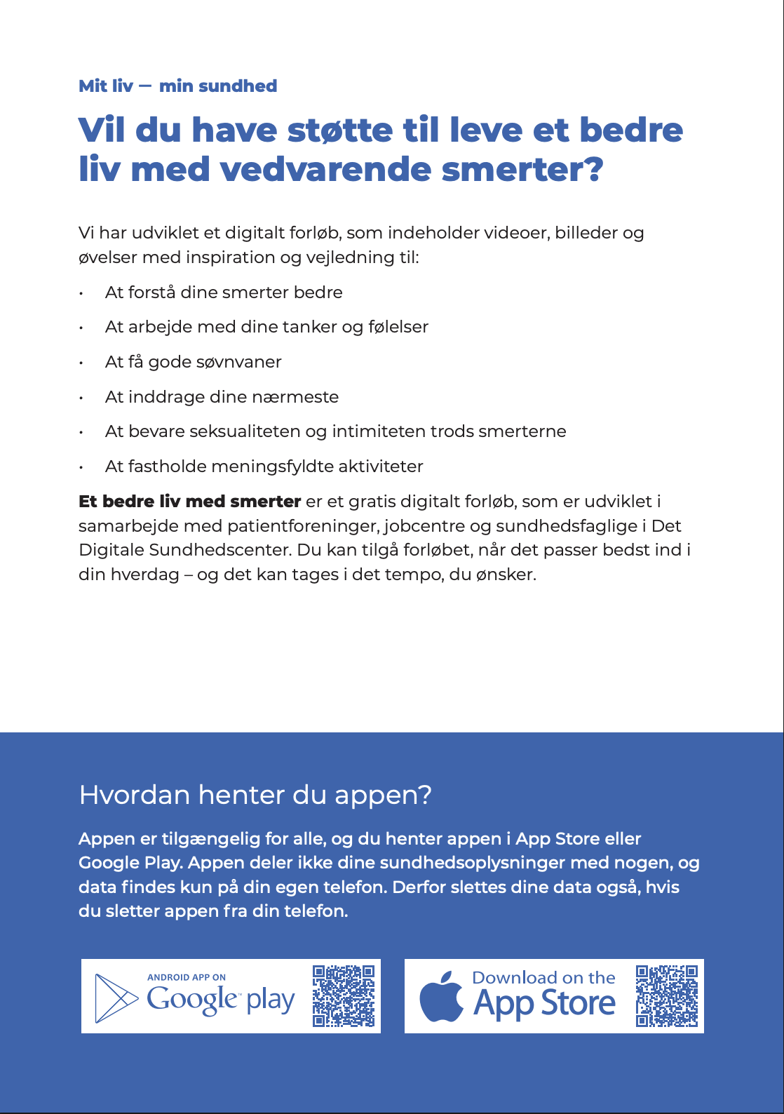 bedre liv med vedvarende smerter. Folderen præsentere det digitale forløb, som indeholder videoer, billeder og øvelser med inspiration og vejledning til: