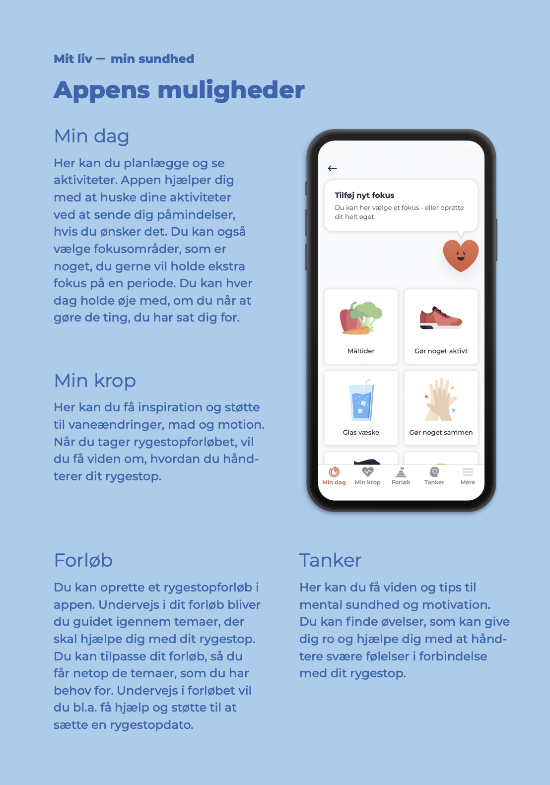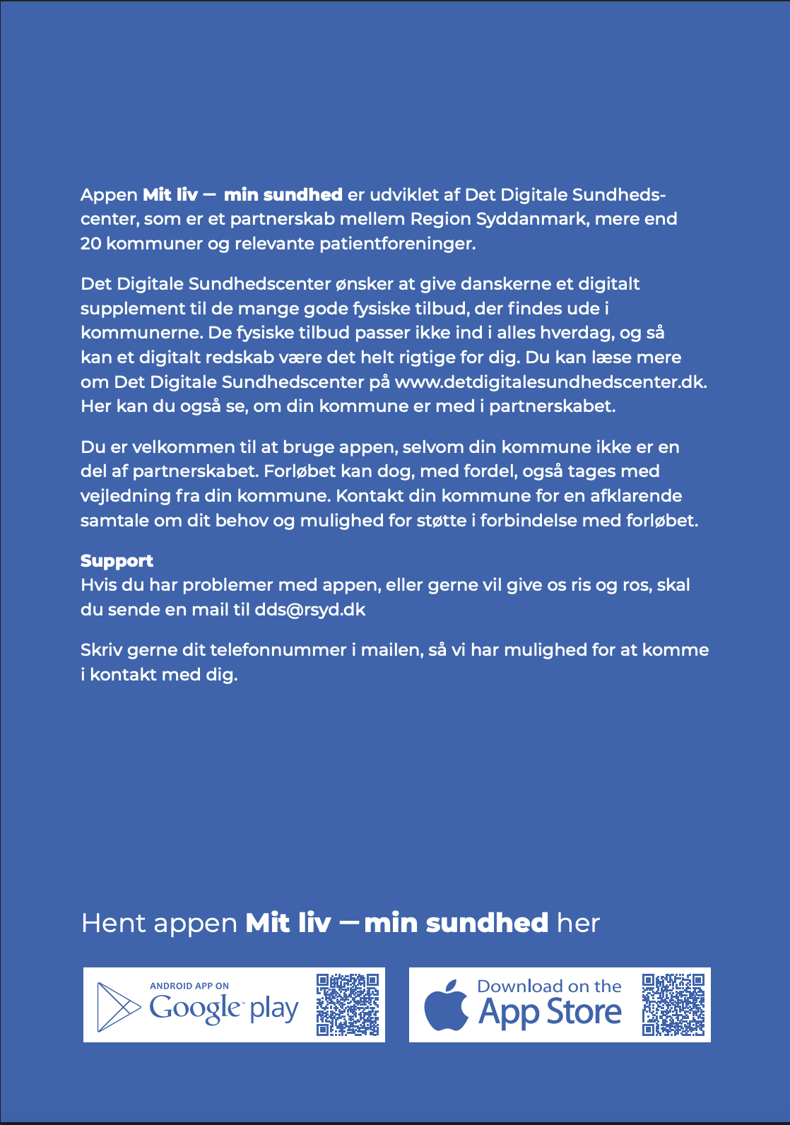 Informationsfolder om appen Mit liv, min sundhed, der indeholder et forløb til dig, der gerne vil have viden og værktøjer til at leve et